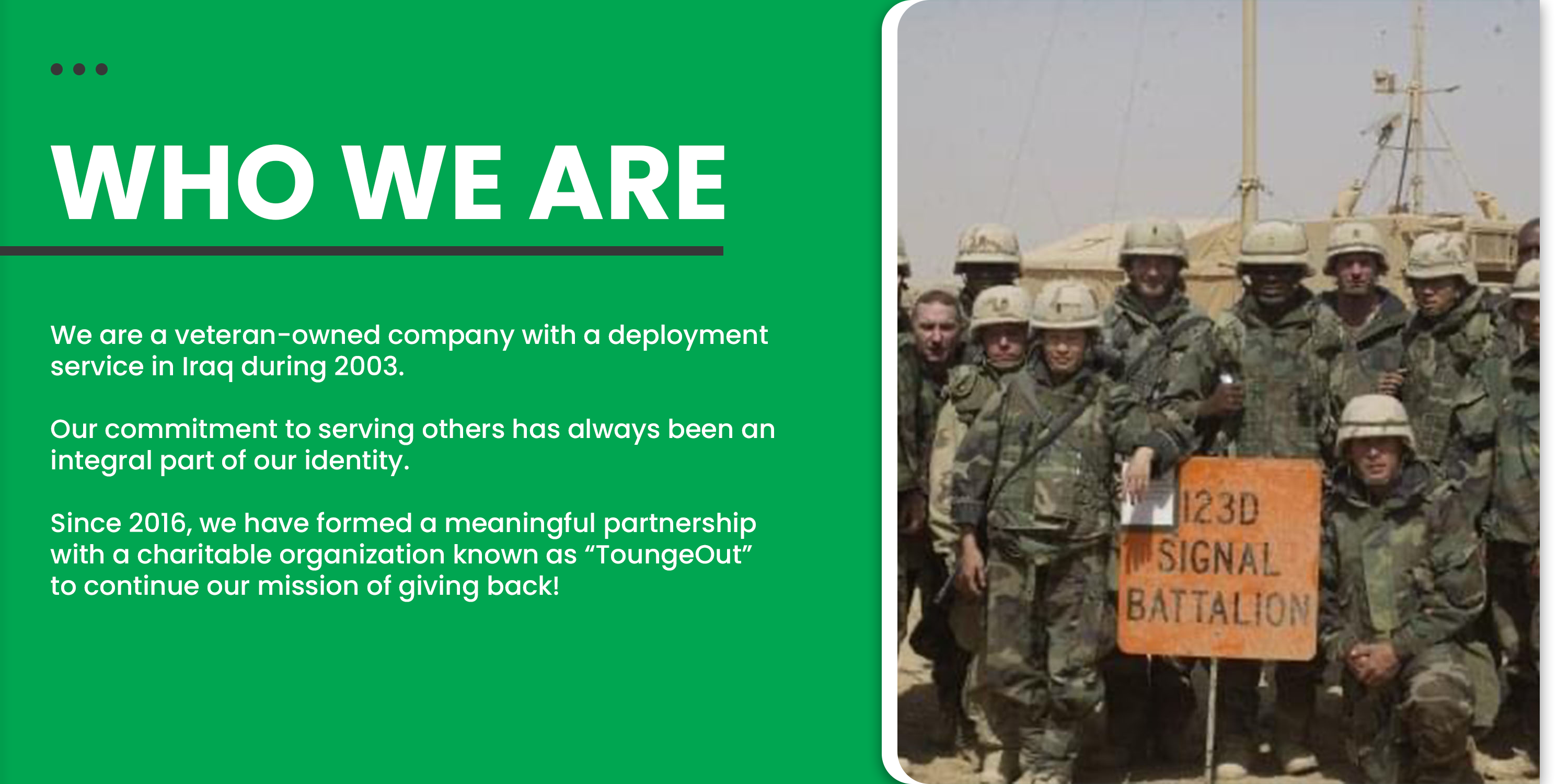 We are a veteran-owned company with a deployment service in Iraq during 2003. Our commitment to serving others has always been an integral part of our identity. Since 2016, we have formed a meaningful partnership with a charitable organization known as "ToungeOut" to continue our mission of giving back!