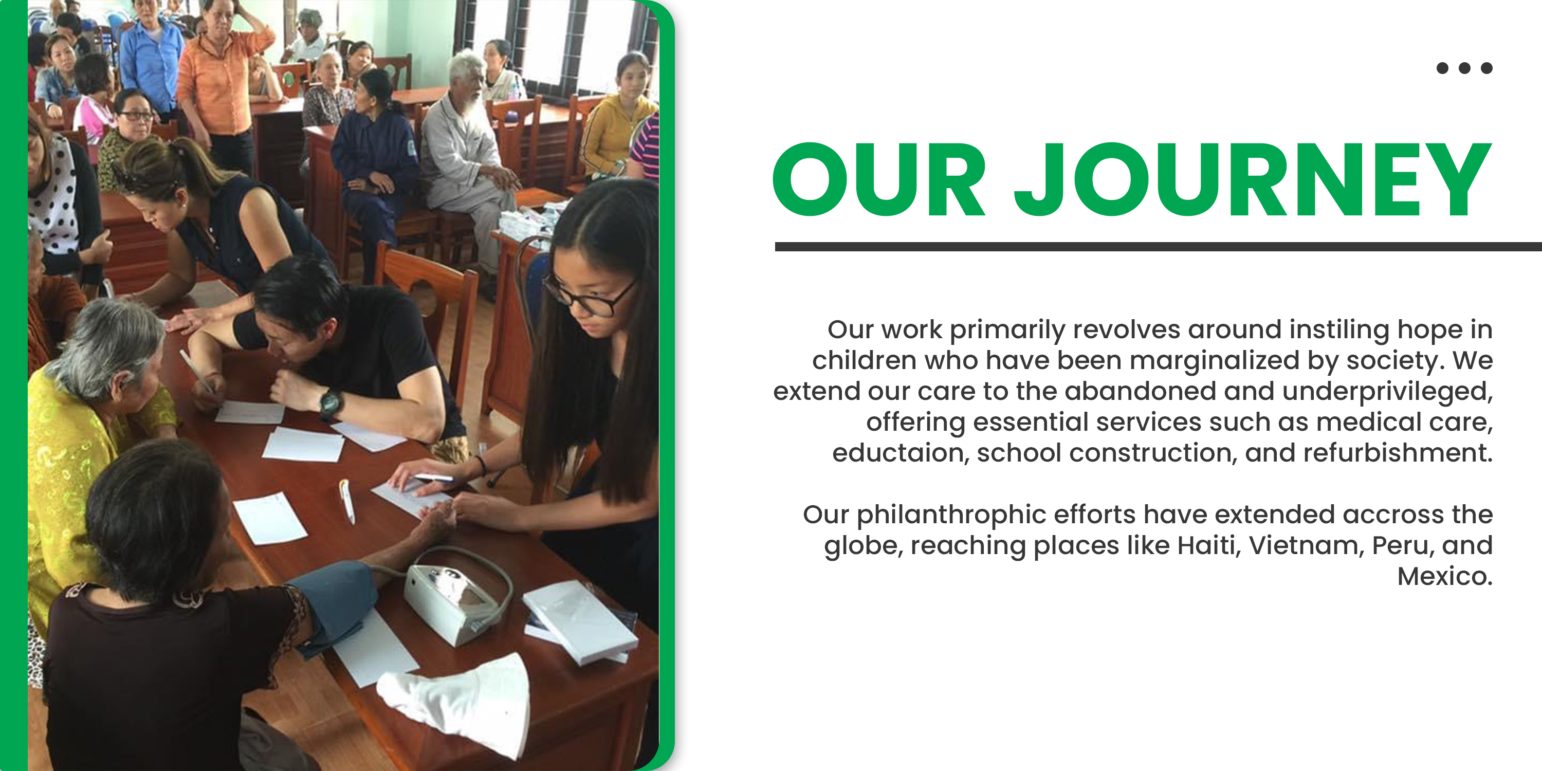Our work primarily revolves around instiling hope in children who have been marginalized by society. We extend our care to the abandoned and underprivileged, offering essential services such as medical care, eductaion, school construction, and refurbishment. Our philanthrophic efforts have extended accross the globe, reaching places like Haiti, Vietnam, Peru, and Mexico.